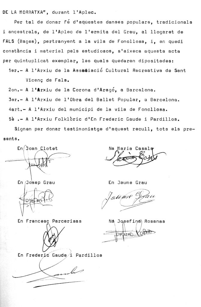 GAUDE, Frederic. Acta i reconstrucció del ball de Les Corrandes de Fals. Any 1979.