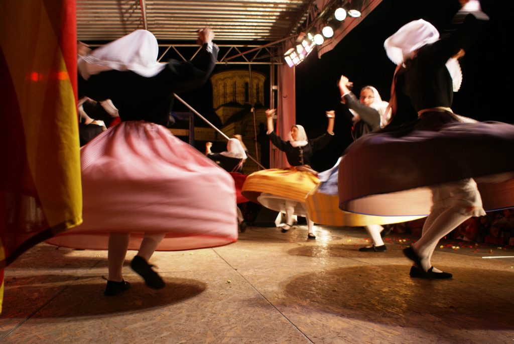 Les actuacions a plaça o escenari estan formades per balls i danses religioses, festives de carnaval, ball pagès, danses de traspàs, etc… totes elles enllaçades formant blocs d’una zona geogràfica determinada. També acompanyades de música en directe amb dues formacions: