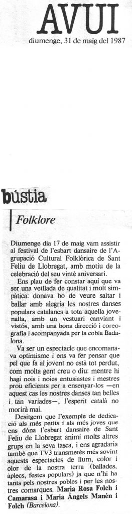 El diumenge 17 de maig de 1987 es va realitzar un festival de dansa per a celebrar el 20 aniversari de l’Esbart Dansaire de l’Agrupació Cultural i Folklòrica.