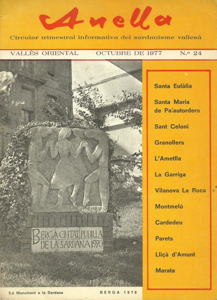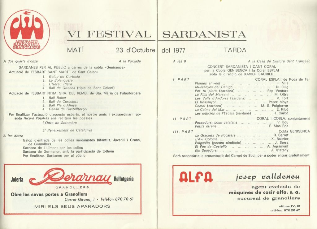 Programa de mà del VI Festival Sardanista on va actuar l'Esbart Sant Martí de Sant Celoni. 23 d'octubre de 1977. Bibliografia i fonts consultades: Arxiu de l'autor. Comarca, Grup Folklòric, Població, Provincia 7 octubre, 2019 Frederic Los comentarios están cerrados.